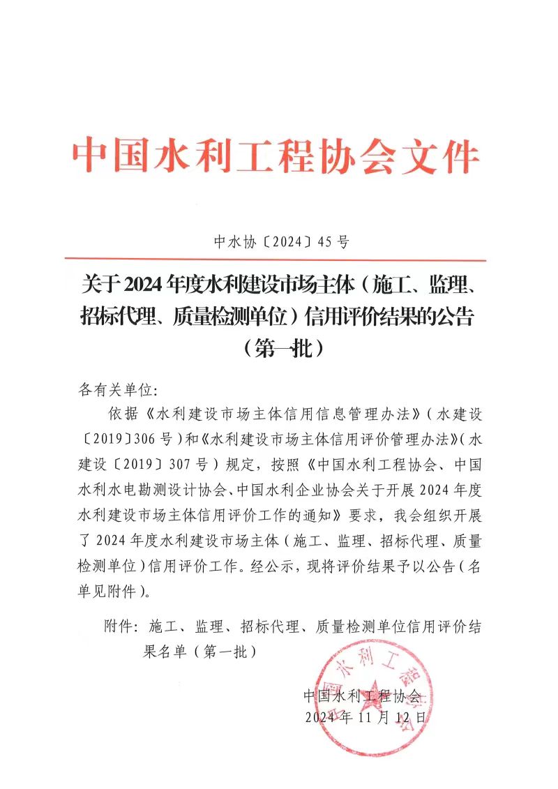 近日,中国水利工程协会公布2024年度全国水利建设市场主体信用评价结果名单,雷竞技公司所属水电建设公司获评施工、监理双AAA级单位。