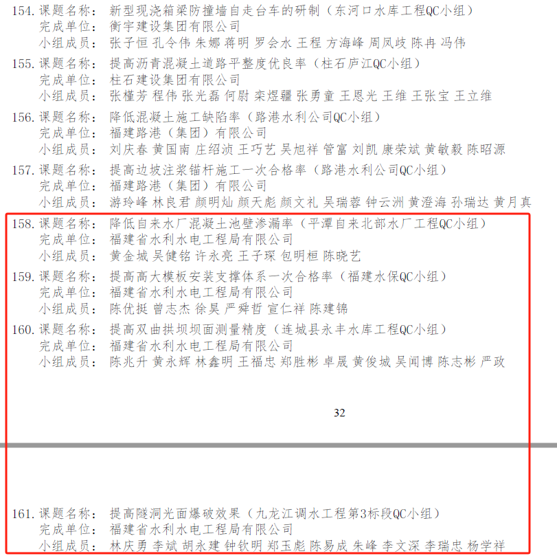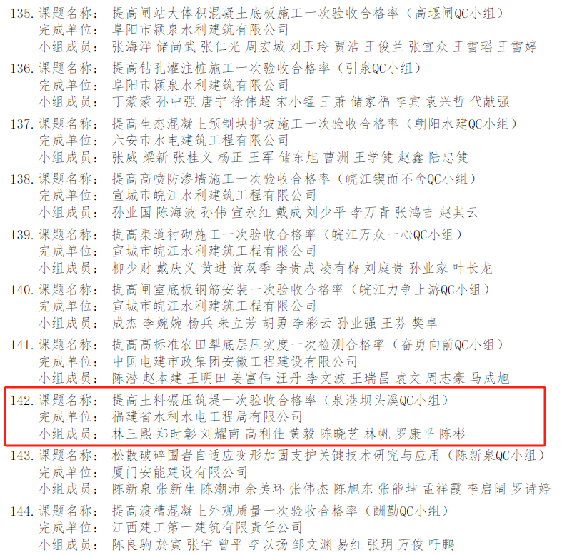 日前,工程局公司选送的8项QC小组成果全部通过中国水利工程协会评审,获评2024年度水利工程优秀质量管理小组成果。其中,《提高土料碾压筑堤一次验收合格率》获得Ⅰ类成果,《降低自来水厂混凝土池壁渗漏率》《提高高大模板安装支撑体系一次合格率》《提高双曲拱坝坝面测量精度》《提高隧洞光面爆破效果》获得Ⅱ类成果,《提高埋石混凝土挡墙PVC排水管一次验收合格率》《提高双曲拱坝自密实砼浇筑质量合格率》《提高隧洞二衬混凝土外观质量验收合格率》获得Ⅲ类成果,集中展示了工程局公司在建工程质量改进与创新发展水平。