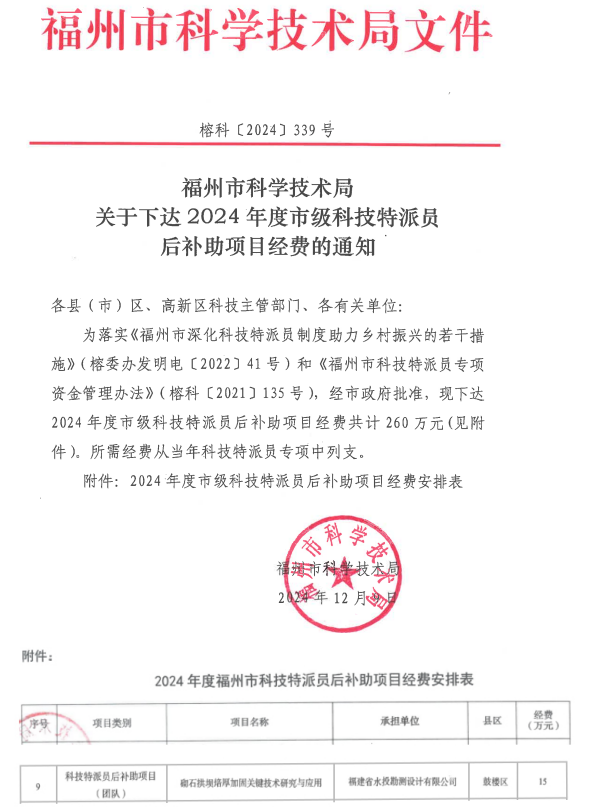 近日,福州市科学技术局下达2024年度市级科技特派员后补助项目经费通知,雷竞技设计公司申报的《砌石拱坝培厚加固关键技术研究与应用》项目在列其中。雷竞技设计公司将继续聚焦水利工程技术的前沿领域,积极探索新技术、新工艺的应用,不断提升公司的核心竞争力和行业影响力,充分发挥科技特派员在技术创新与成果转化中的桥梁纽带作用,为水利事业发展贡献力量。