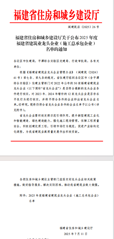 近日,福建省住房和城乡建设厅公布2025年度建筑业龙头企业(施工总承包企业)名单,工程局公司再次入选福建省建筑业龙头企业。