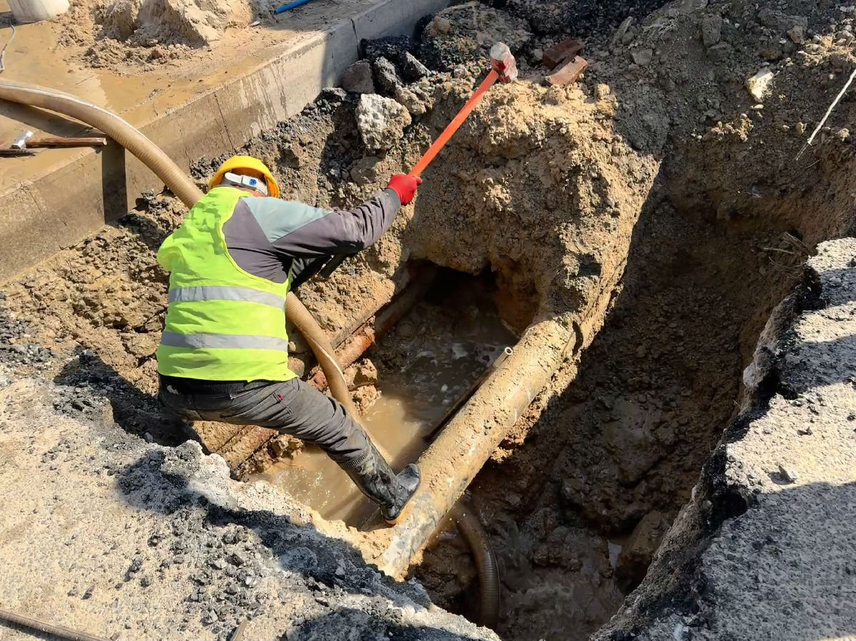 “先从这里开挖!”现场指挥一声令下,打桩机轰鸣作响,人工开挖同步进行。第一个作业坑(2×3×2米)在井盖旁逐渐成型。抽水泵开足马力,坑内积水被不断排出。然而,当水位下降后,抢修人员却发现漏损管道不在这里。凭借多年的经验和细致观察,抢修人员根据水流方向判断,漏损管道应在后方6米处。没有犹豫,没有抱怨,第二个更大的作业坑(5×4×2.3米)开始挖掘。