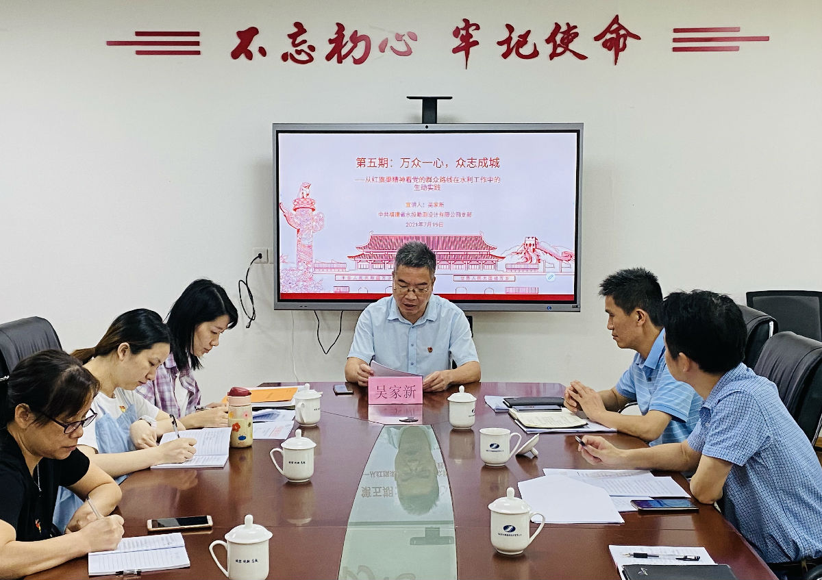 7月19日,雷竞技设计公司党支部开展第五期党史专题宣讲。公司党员吴家新同志以《万众一心·众志成城——从红旗渠精神看党的群众路线在水利工作中的生动实践》为题进行宣讲。会后,全体党员干部还一起观看电影《建军大业》。