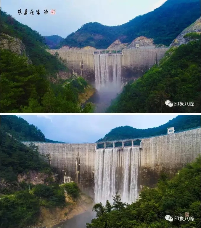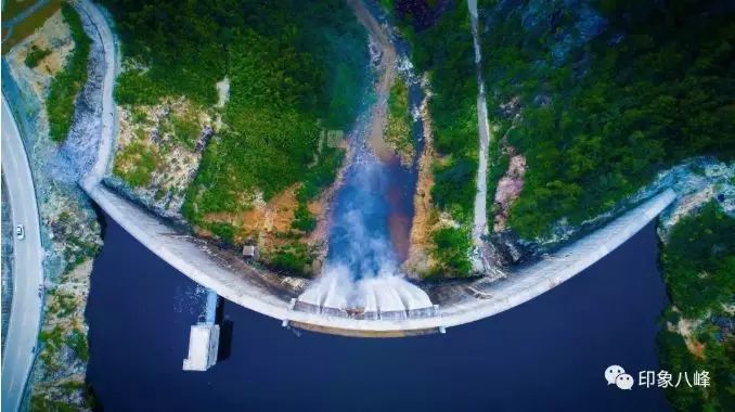 受连日降雨影响,洛江八峰水库水位急剧上涨,至8月16日凌晨,水库蓄水至202米高程,库水经溢流口倾泻而下,在坝前形成一道美丽的瀑布。