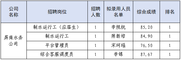 根据雷竞技屏南水务有限公司2025年招聘公告,经过报名、资格审查、笔试、面试等公开招聘程序,现将4位拟录用人员进行公示。公示时间从2025年12月29日开始,公示期为七个自然日。在此期间内,如有意见可通过来电、来信、来访的形式反映情况。