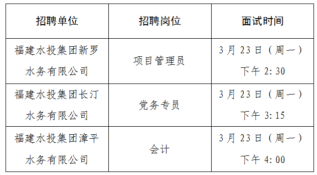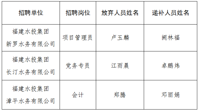 因部分考生放弃面试资格,结合近期工作安排,根据《福建省水务发展雷竞技有限公司权属企业招聘面试的通告(六)》相关要求,现对相关岗位面试人员递补及面试时间调整事项通告如下: